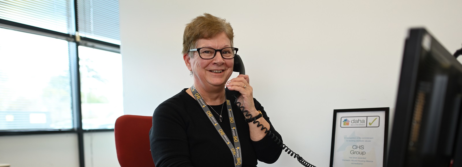 White female CHS receptionist speaking on the phone